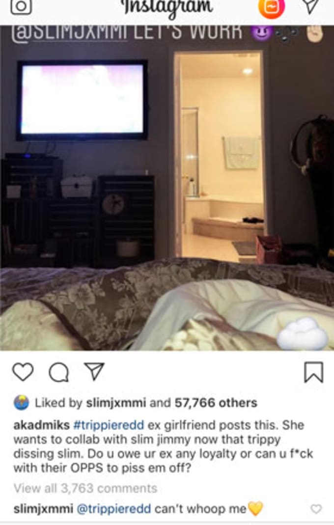 After a few more insults were exchanged, things went quiet until yesterday. But then Trippie's ex-girlfriend reached out to Slim through social media and asked him to collaborate on music, presumably just to get under Trippie' skin.